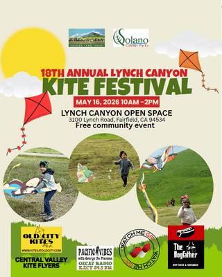 Join Solano Land Trust and Solano County Parks for the Annual Lynch Canyon Kite Festival on May 16th, 2026! The Kite Festival, which takes place in May from 10am to 2pm at Lynch Canyon Open Space, is a free event open to everyone! Lynch Canyon is an open space park owned by Solano Land Trust and operated through partnership by Solano County Parks. Lynch Canyon has trails for hiking, biking and equestrian use among the windswept rolling hills between Fairfield and Vallejo, making it the perfect place to fly a kite.